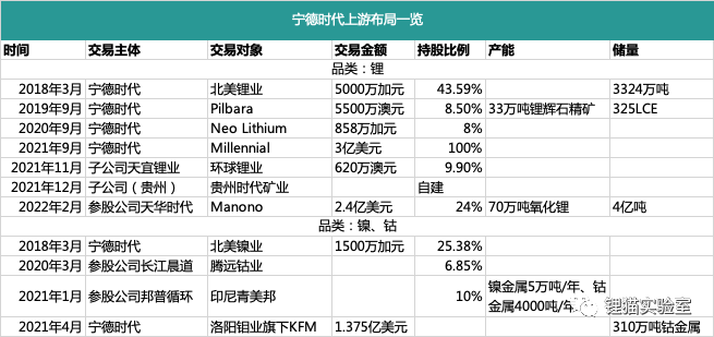 從2018年3月開始到今年2月時止,寧德時代對外投資及自建鋰礦7個項目,其中大部分集中于海外,直到2021年寧德才在國內布局了貴州時代礦業,在靠近礦產的地方自建礦山。