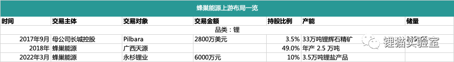 2018年,蜂巢能源獨立之后,又分兩次分別投資了廣西天源和永杉鋰業,共計鎖定了6萬噸鋰產品產能。