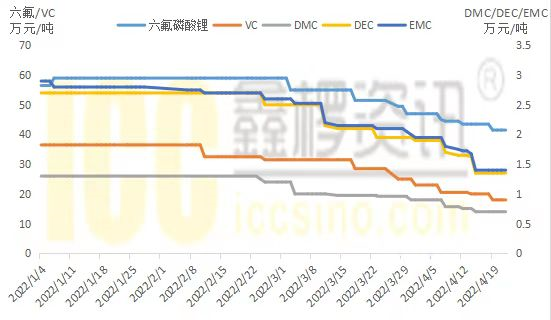 電解液及材料端需求主要受下游電池廠和新能源汽車的影響,低端數(shù)碼廠市場相對低迷,受春節(jié)淡季影響,2-3月部分小的電池廠因原材料價格過高而暫時停工停產(chǎn);隨著新一輪疫情影響下游部分上海、吉林等地的新能源汽車廠停工停產(chǎn),部分電池廠降負荷生產(chǎn),市場情緒一度較為悲觀。