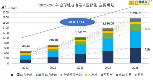根據(jù)鑫欏數(shù)據(jù)庫統(tǒng)計,2021年鋰電池的需求量為505.42GWh,預(yù)計到2025年,全球鋰電池的需求量將達到1794.7GWh。到2025年,新能源車和儲能仍將是鋰電池的主要的應(yīng)用領(lǐng)域,這兩個領(lǐng)域的鋰電池出貨量合計占比預(yù)計高達87%,其中,動力電池的市場占比將達到72%,儲能的占比將達到15%。