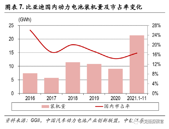 比亞迪由于電池不對外開放,雖然2016到2018年裝機量顯著提升,但是從18年開始裝機量逐年走低,其市場份額也從20%減少到14.3%。直至2021年,比亞迪國內新能源汽車銷量和動力電池裝機量才再次迎來增長,其市場份額重回20%以上。