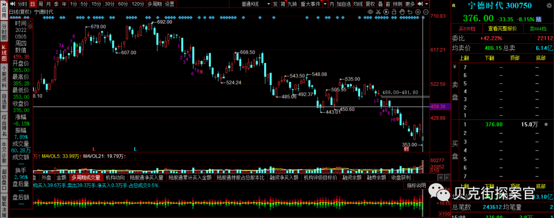 體現在二級市場,寧德時代股價幾近腰斬,從2021年12月687元每股的高價,跌至5月5日收盤的376元每股,跌幅超45%。