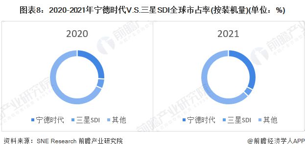 根據(jù)SNE Research的統(tǒng)計,寧德時代的鋰電池裝機量2020年、2021年均保持在全球第一且呈現(xiàn)穩(wěn)步上升趨勢;受制于產(chǎn)能以及鋰電池行業(yè)的激烈競爭,三星SDI的全球市占率有所降低,由2020年5.8%的2021年下降至4.5%。