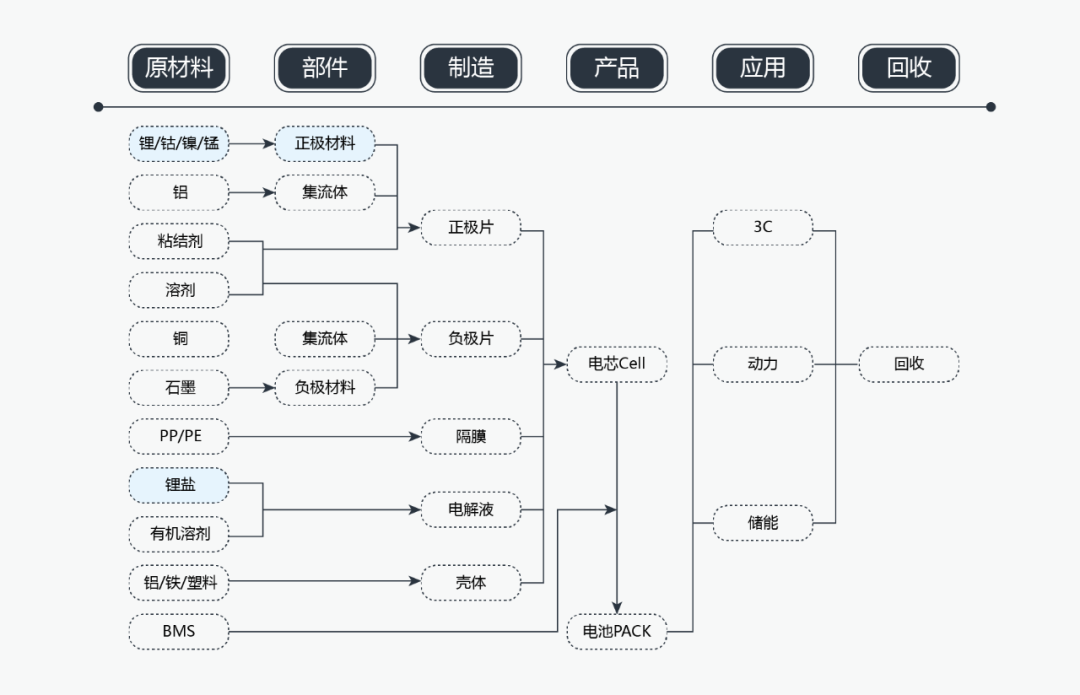整個鋰電池產業鏈涉及的環節分為:上游原材料,中游材料及部件,下游產品、應用及回收。