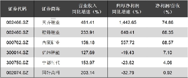 以國內市場規模最大的兩家鋰電礦商贛鋒鋰業、天齊鋰業為例,今年一季度,兩家公司營收同比增長233.91%、481.41%,歸母凈利潤增速分別為640.41%、1442.65%,遠超下游任何一個環節。而寧德時代、國軒高科、億緯鋰能等電池企業今年一季度營收同比增速雖然均達到120%以上,但同期歸母凈利潤同比分別下降23.62%、32.79%、19.43%,上述企業一季度凈利潤占營業總收入的比例僅為4.06%、0.92%、7.10%。