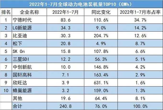 今年1-7月,全球動力電池裝機量240.8吉瓦時,同比增長76%。與去年相比,寧德時代、LG新能源和松下“三雄爭霸”的格局已不復存在,取而代之的是寧德時代、LG新能源和比亞迪“三分天下”的局面。