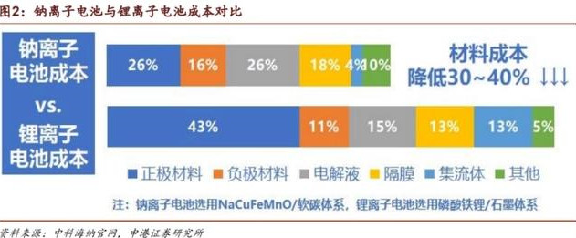 正因?yàn)殁c儲(chǔ)量豐富,來源廣泛,所以其成本比較低,據(jù)中科海鈉披露,鈉離子電池材料成本比磷酸鐵鋰體系電池低30~40%。