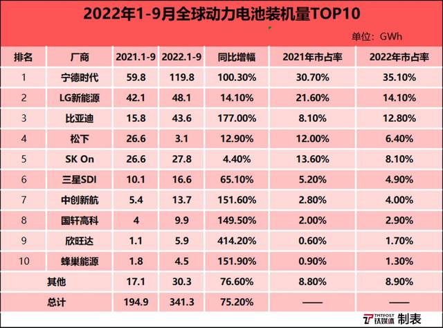 有意思的是,從去年開始,寧德時代、LG新能源和松下分別代表“中韓日”位列前三的格局已經悄然發生了轉變。取而代之的則是寧德時代、LG新能源和比亞迪“三分天下”的局面。從數據也可以看到,松下在9月的市占率再次下降了5.6個百分點,3.5GWh的成績尚不足比亞迪的一半,而TOP10中也僅有松下一家日系企業上榜。
