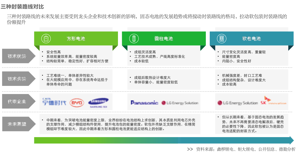 電動汽車所用電池按外形和封裝形式分為方形、圓柱、軟包三種,方形和圓柱電池均使用金屬硬外殼,軟包電池使用鋁塑復合膜。