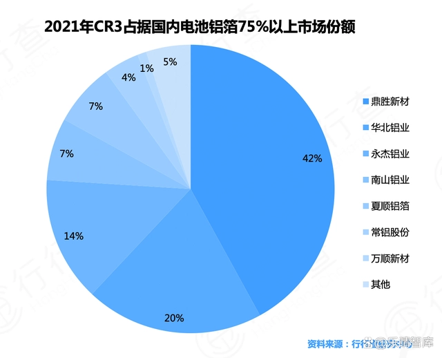 2021年,鼎勝新材、華北鋁業(yè)、永杰新材三家公司電池箔產(chǎn)量占據(jù)了75%以上的市場(chǎng)份額。其中,龍頭企業(yè)鼎勝新材貢獻(xiàn)了42%的市占率,地位相對(duì)穩(wěn)固。