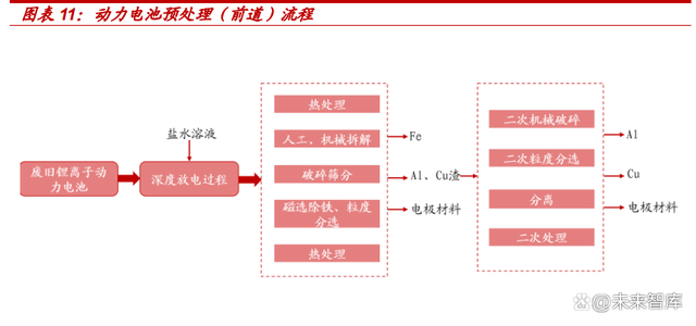 前道(預處理過程) 1) 放電。由于鋰電池受擠壓后容易升溫爆炸,通常在破碎前需要放電,目前放電主要通過兩種方式,一是通過電阻放電,二是通過鹽水浸泡方式, 但浸泡方式缺點是容易造成水污染。 2) 電池包拆解。將模組通過人工和半機械的方式拆開,取出電芯;并回收 銅、鋁殼等金屬。 3) 破碎。將電芯中的裸電芯取出使用破碎機打成黑粉。 4) 篩選。在氣流作用下根據不同重量分布沉積,按重量大小排序上、中、 下分別是隔膜、負極和正極,經過破碎篩分后環節的產物統稱為黑粉。