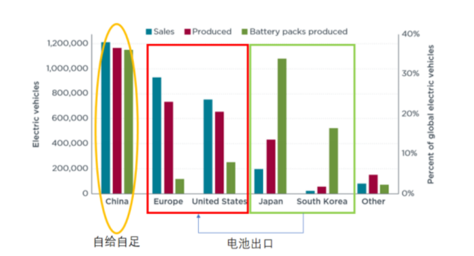 一般來說,日韓電池是歐美地區車企的首選。例如發展勢頭最猛的特斯拉,就是由松下獨家供應電池;通用、福特等企業選擇LG作為主要供應商。日韓成為電池的主要出口國,美歐地區則是相應的進口國;中國的情況則是自產自銷。