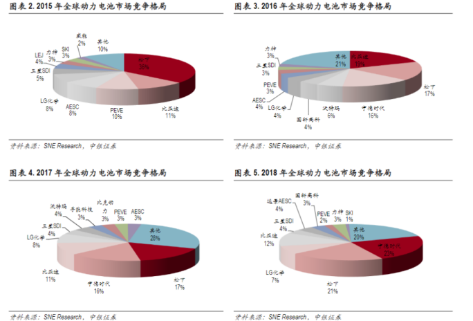 這時,松下、LG化學、三星SDI、AESC四家公司占據國際動力電池市場的主要份額,其中松下作為特斯拉最主要的動力電池供應商,在收購三洋后,憑借特斯拉的發展穩居市場領導者地位,將當時的市場份額穩定在30%以上。
