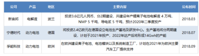2018年,新宙邦、寧德時代和孚能科技等企業都宣布了在歐洲建廠規劃,成為第一批計劃海外建廠的企業。