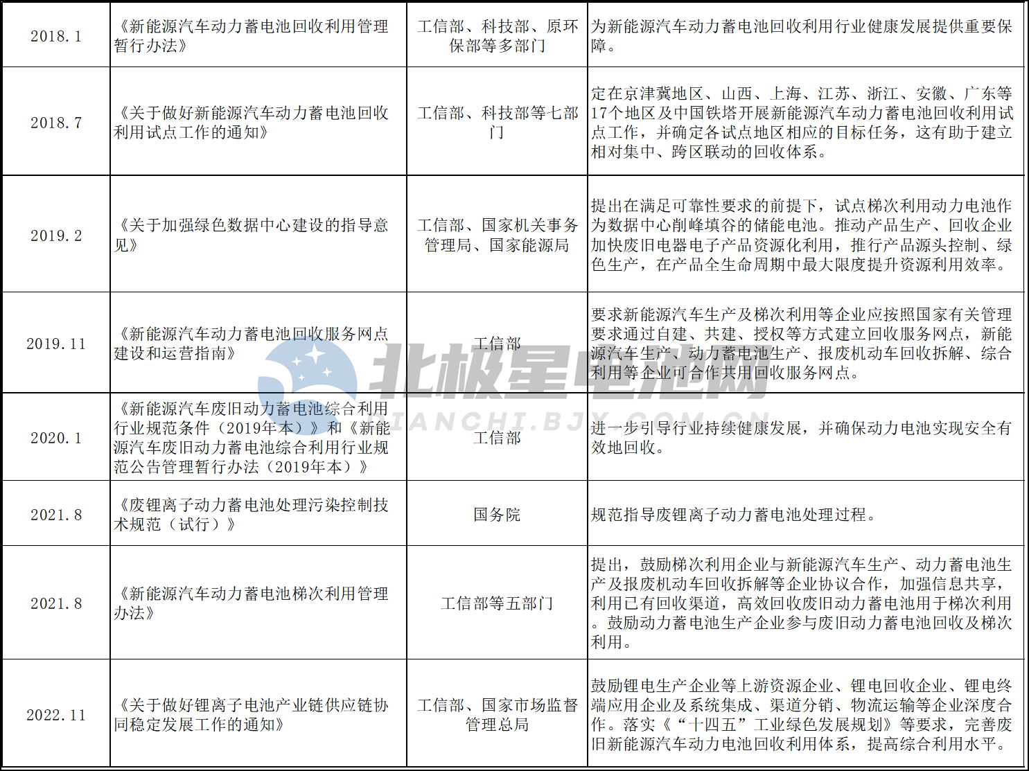 2016年國家發展改革委 、工業和信息化部 、環境保護部 、商務部 、質檢總局《電動汽車動力蓄電池回收利用技術政策》、《新能源汽車廢舊動力蓄電池綜合利用行業規范條件》、《新能源汽車廢舊動力蓄電池綜合利用行業規范公告管理暫行辦法》。