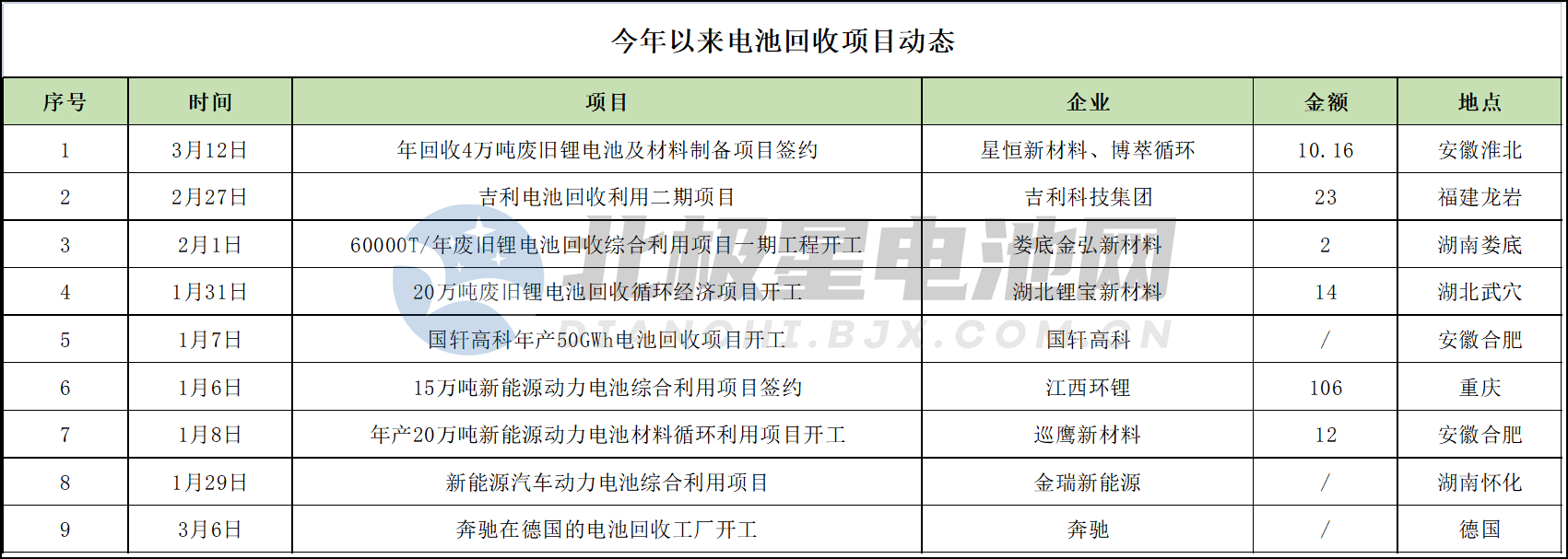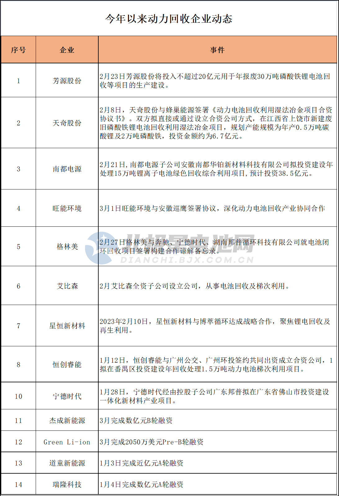 電池回收市場的不斷升溫,資本市場聞風而動,今年以來,多家動力電池回收企業獲得資本青睞。1月3日道童新能源完成近億元A輪融資,1月4日瑞隆科技完成數億元A輪融資,3月新能源完成數億元B輪融資。