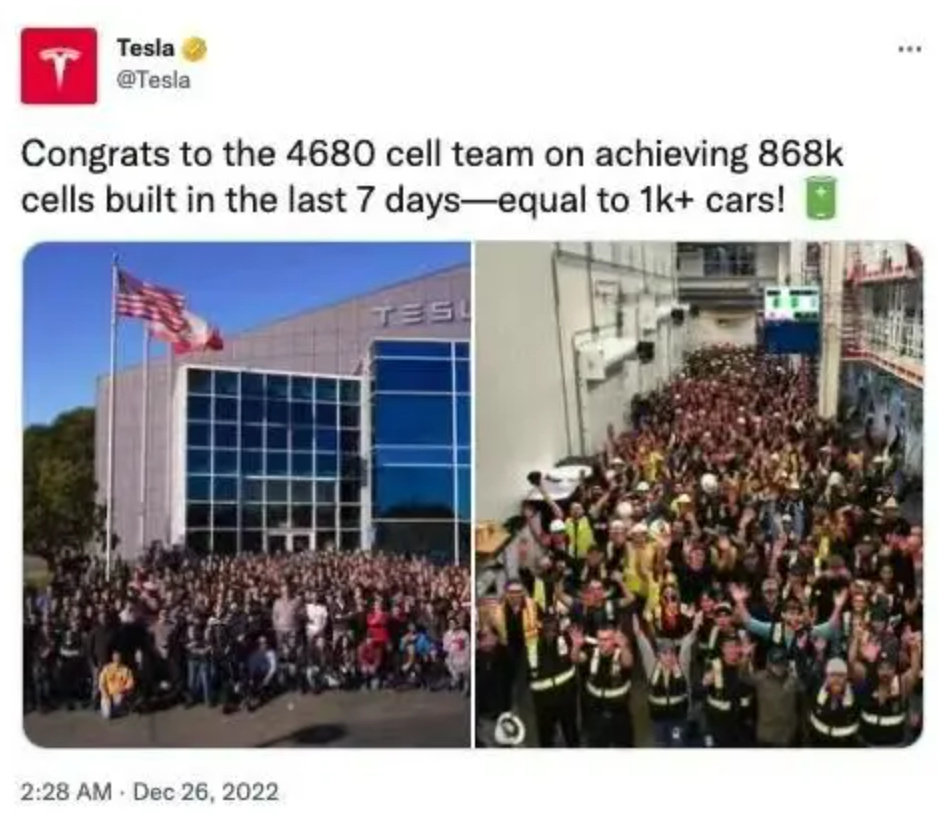 2022年12月26日,特斯拉官方宣稱目前4680電池的周產量達到了86.8萬塊,足以支持特斯拉每周生產1000輛電動汽車。