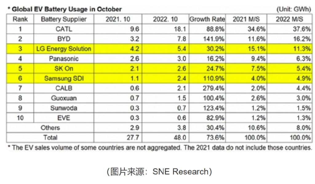 中國汽車動力電池產業創新聯盟數據顯示,2022年寧德時代以142.02GWh裝車量依舊穩居榜首,不過市占率卻較2021年同期下降了3.9%,2022年為48.2%。比亞迪的電池裝車量為69.10GWh,市占率為23.45%,同比增長7.2%。寧德時代市占率的下跌和大客戶特斯拉的增速放緩有一定關系,而比亞迪則迎來爆發,全年銷售186.9萬輛,超越特斯拉成為全球銷冠,比亞迪不僅能夠自給自足,還可以擴大外供,福特、一汽等車企都配備了刀片電池,甚至連寧德時代的大客戶都傳出要采用刀片電池,可見,比亞迪和寧德時代的“追逐戰”將愈加激烈。