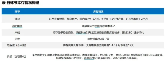 正如上述人士所言,東吳證券在一份研報中指出,在鋰鹽環節,碳酸鋰國內庫存4-5萬噸,約為2022年1-1.5個月產量,礦石庫存1-2個月;而在電池環節,廠商從22Q4開始去庫存,生產材料均維持極低庫存,電池本身庫存不足1個月;另外在中游材料方面,正極和電解液庫存周期大幅下降至7天左右,負極因石墨化需要一個月時間,庫存周期較長,而隔膜約為一個月正常庫存。