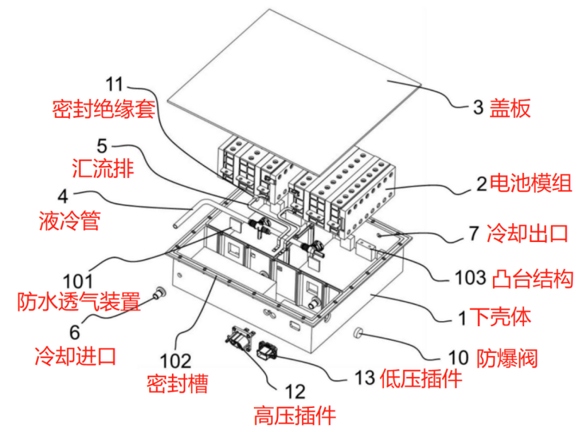東風的浸沒式冷卻方案是在一個固態電池包上,集成時冷卻液(非冷卻油)半浸沒模組,通過密封結構將冷卻液密封在下箱體和模組構成的空間內。
