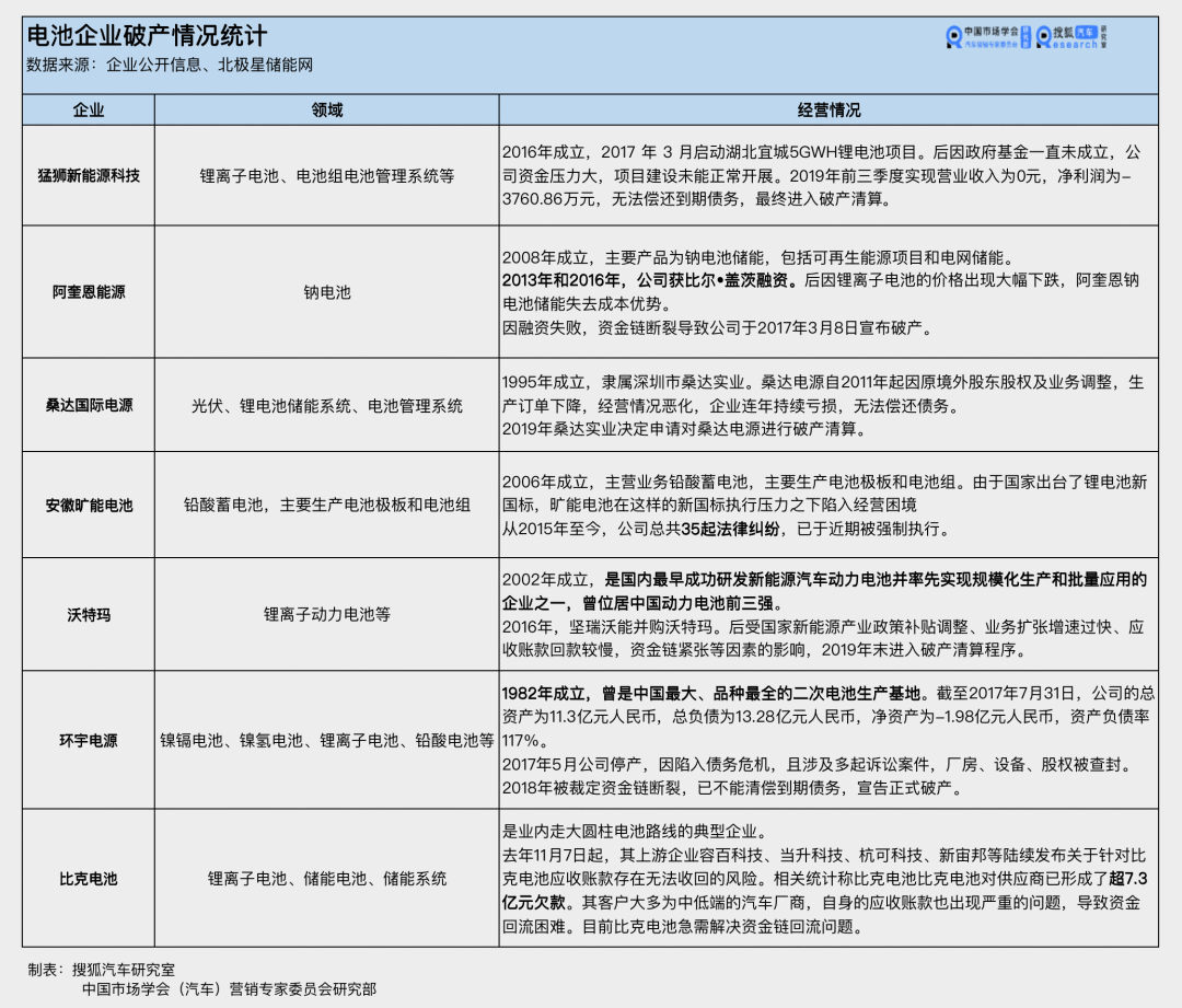 根據搜狐汽車不完全統計,近三年來,有至少6家國內動力電池相關企業走到了破產這一關,而部分跨界的玩家也悄悄退場回歸老本行,又或者是受到下游車企客戶的影響導致資金回籠困難。