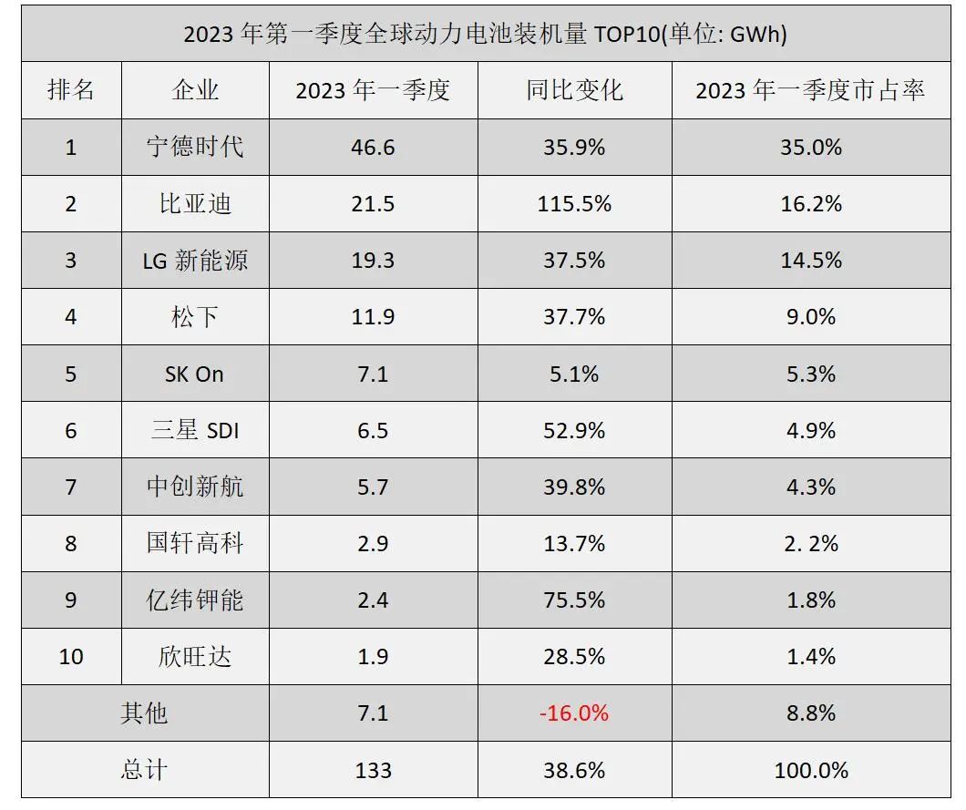 2023年第一季度,全球動力電池總裝機量為133GWh,同比增長38.6%,其中排名前十的企業,有六家是中國企業,三家是韓國企業,一家是日本企業。