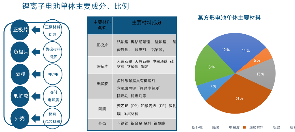 從結(jié)構(gòu)來看,鋰離子電池單體由正極片、負極片、電解液、隔膜和外殼組成。其中,正極片主要材料成分是鈷酸鋰、鎳鈷錳酸鋰、錳酸鋰、磷酸鐵鋰、導(dǎo)電劑、鋁箔等;負極片主要材料成分是人造石墨、天然石墨、中間項碳、硅材料、鈦酸鋰、銅箔;電解液主要材料成分是多種碳酸脂類有機溶劑、六氟磷酸鋰(鋰鹽電解質(zhì))、阻燃劑、穩(wěn)定劑等;隔膜主要材料成分是聚乙烯(PP)和聚丙烯(PE)微孔膜、涂層材料;外殼主要材料成分是不銹鋼、鋁合金、塑料、鋁塑膜。