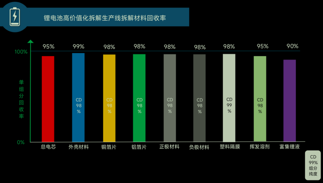 在演講中,郭杰指出,鋰離子電池再生利用終極解決方案的評價標準是安全、環(huán)保、固廢資源化率。終極解決方案分兩步走,一是對電池全組分精細化拆分回收,二是對各組分的再生利用。鋰電池高值回收自動化生產(chǎn)線,可回收電池全組分材料,總體回收率及純凈度均達95%以上,其拆解回收工藝流程及物料轉(zhuǎn)化過程不破碎、無燃燒微排放;拆解回收的材料有正極材料、濾波片、銅箔片、負極材料、正極材料、有機溶劑、外殼材料和富集鋰液這8種,單項材料回收率最高達到99%(見下圖)。