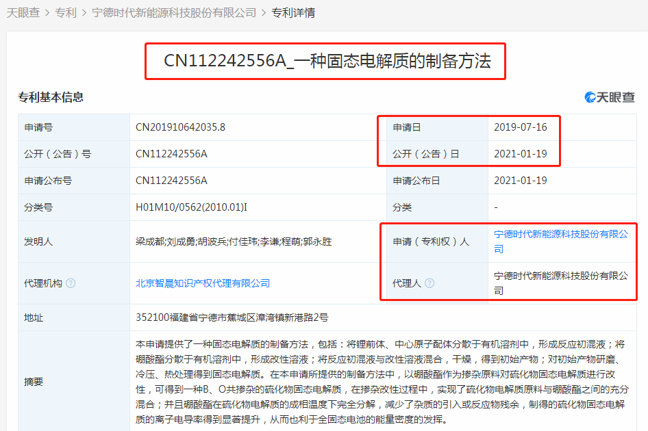 以寧德時代為例,雖然其主要陣地仍在液態電池,在半固態電池上的聲量也相對較大,但其在固態電池上仍保持著較強的競爭力。2021年5月,寧德時代就曾表示,已經可以完成固態電池的樣品;今年1月,天眼查顯示寧德時代新增了兩項有關固態電池的專利,分別為“一種固態電解質的制備方法”和“一種硫化物固態電解質片及其制備方法”,表明了其在固態電池領域的絕對地位。