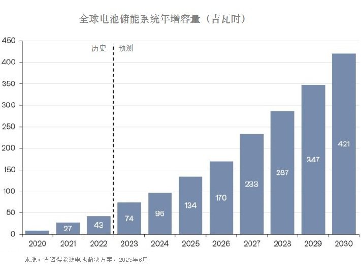 這家商業情報公司預測,2030年,電池儲能每年的容量將超過400吉瓦時,而2022年只有43吉瓦時。2023年,電池儲能將新增74吉瓦時,較2022年增加72%。