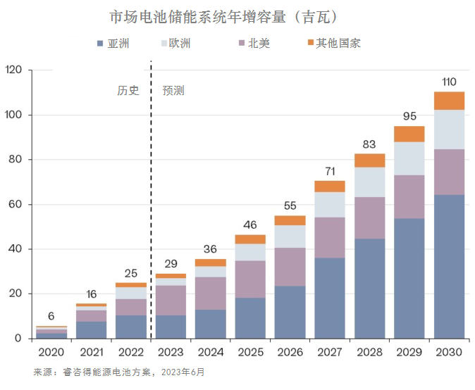 “這與目前形勢不同,我們預計,2023年末新增容量主要來自北美地區,其在BESS的占比為45%”,睿咨得能源公司稱。