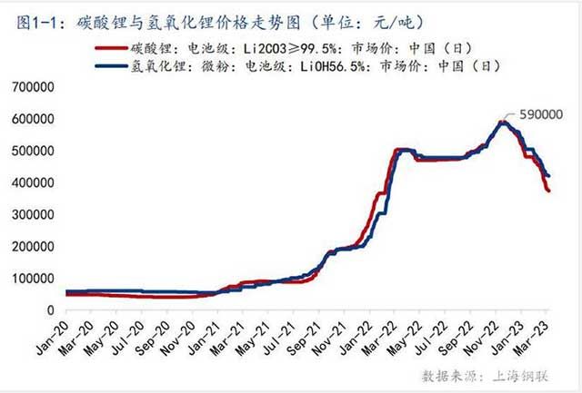 作為鋰電池主要原材料的碳酸鋰,近年價(jià)格一直存在波動(dòng)。2022年,碳酸鋰在動(dòng)力電池總成本中占比為20%至30%,碳酸鋰價(jià)格上漲,直接推動(dòng)動(dòng)力電池生產(chǎn)成本飆升,電池級(jí)碳酸鋰的價(jià)格一度高達(dá)60萬元/噸。然而,進(jìn)入2023年,電池級(jí)碳酸鋰價(jià)格一路下跌,4月份最低跌破20萬元/噸的關(guān)口。