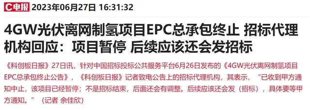 此外,甘肅4GW光伏離網制氫項目EPC總承包招標公告于近日發布,該項目計劃占地面積10萬畝,建設4GW離網光伏,配套建設800MW/1600MWH儲能設備,同時購置制氫設備8638臺/套。針對五天后發布的《4GW光伏離網制氫項目EPC總承包終止公告》,招標代理機構回應:項目暫停,后續應該還會發招標。