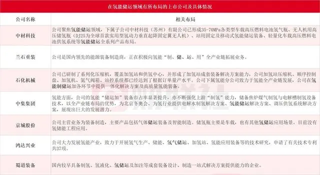 據財聯社不完全統計,在氫能儲運領域有所布局的上市公司包括厚普股份、蘭石重裝、石化機械、中集集團、京城股份、鴻達興業和蜀道裝備等,具體如下: