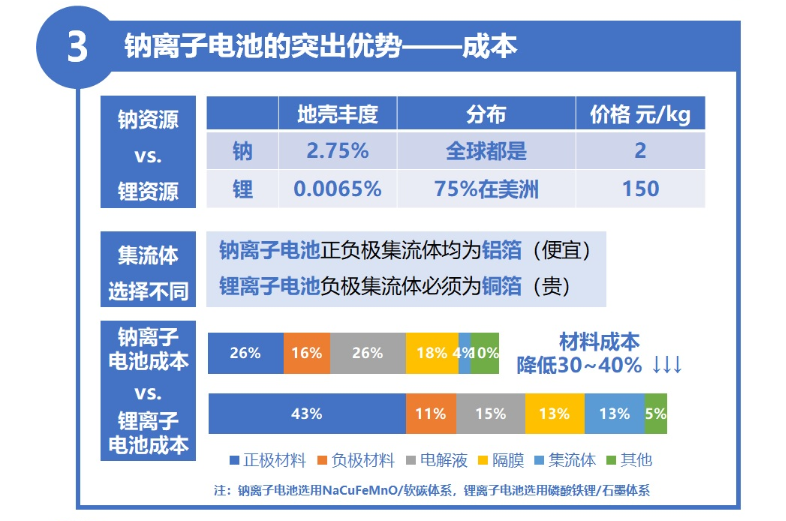 相反的,鈉礦在地殼中的儲備占比高達2.64%,且在全球分布廣泛,原材料供應可靠,低溫放電性能優異,安全性高,環保且成本低,能以鋰離子電池30%-40%的成本優勢達到鋰電池70%的性能。