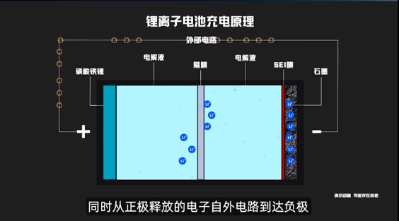 鋰電池在充電時,正極釋放鋰離子,鋰離子通過電解液穿過隔膜,嵌入負極。同時,從正極釋放的電子也通過外電路達到負極,維持電化學的平衡。