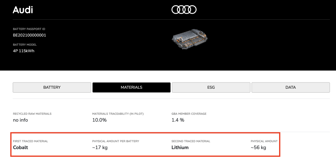 奧迪的電池護照中清楚顯示了鈷和鋰的用量