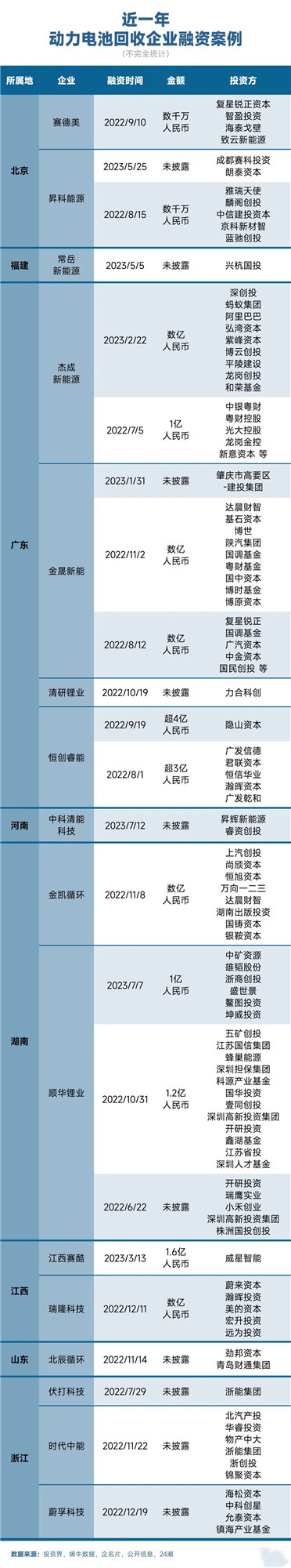 資本狂熱追逐下,甚至連動力電池回收領域的融資時間都呈現增長趨勢。24潮團隊根據公開數據不完全統計,近一年動力電池回收領域融資事件已逾20起,越來越多的投資人涌入這一賽道。