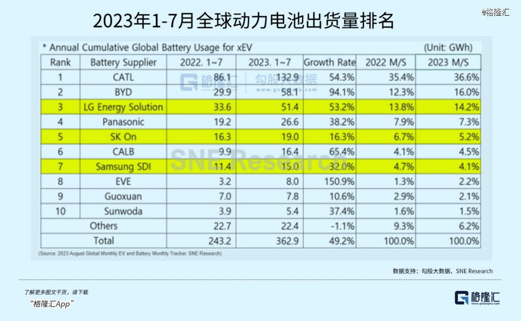 出貨量前十名除了寧王依然守著三成份額外,日韓系企業的份額比去年同期下滑了2.3個百分點,反映了中系電池企業集中度持續提升。