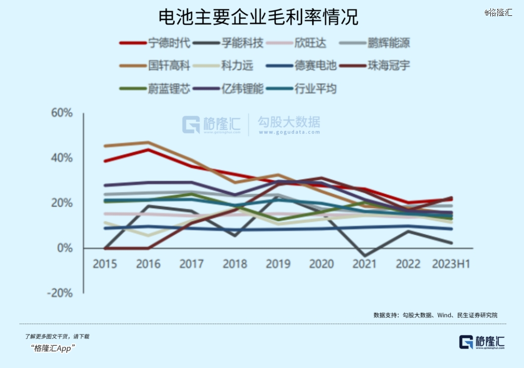 從 10 家電池公司對比來看,2023H1 寧德時代的毛利率最高,為 20.25%;2023Q2 珠海冠宇毛利率最高,為 22.47%。