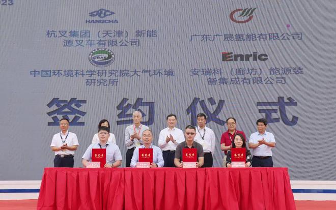 活動當日,廣晟氫能聯合杭叉新能源正式發布45噸氫燃料電池正面吊,并與中集氫能、天養新能源簽署港口應用及配套支撐戰略合作協議。