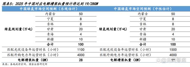 以 1000 標方/小時堿性電解槽為例測算,基于電解槽不同的年運營小時數,綠氫生 產規劃量對應的電解槽裝機規模將有所區別,當電解水制氫的電來自于光伏時,根 據光伏年發電小時數,樂觀和中性情況下預計電解槽分別年運行1100和1500小時, 同時考慮到部分電解槽的電采用外購電力的情況,假設 2025 年光伏供電和外購電力 占比均為 50%、外購電力年利用小時數為 4000 小時,100 萬噸綠氫對應樂觀和中性 情況下電解槽裝機量分別為 28GW 和 19GW。