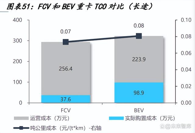 全生命周期成本是衡量重卡經濟性的核心指標。成本是評估技術路線商用化可行性的關 鍵,全生命周期成本(TCO)是從卡車整個生命周期來考量成本,包含車輛購置成本以及 運營成本。當燃料電池重卡 TCO 比純電動重卡更低時,燃料電池重卡便是終端用戶的經 濟性更優選擇。目前燃料電池系統占整車成本約 60%,運營階段主要以氫氣費用為主, 因而系統單價和氫氣售價是影響燃料電池重卡 TCO 的主要因素。