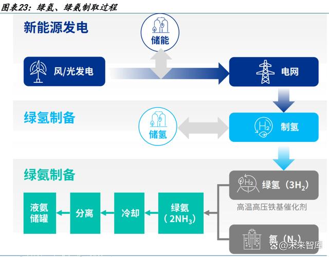 制氫環節是工業合成氨主要碳排放來源,電解水制氫可實現零碳排放。合成氨工業對氫 氣來源無特殊要求,可采用綠氫替代煤制氫與天然氣制氫,替代煤制氫后減碳超 2 億噸/ 年,實現除供熱環節外的零碳排放。傳統工業合成氨生產采用 Harber—Bosch 工藝,反 應方程式為 3H2+N2→2NH3,其中的 N2來自空氣分離,工藝簡單,氫氣來自煤制氫或天然氣 制氫,工藝較為復雜。煤制氫合成氨以及天然氣制氫合成氨都是“留氫去碳”,碳排放較 為嚴重,是合成氨工業主要的碳排放來源。 電解水制氫:反應方程式為:2H2O→2H2+O2。根據電解水制氫方程式,生產氫氣不產 生碳排放。煤制氫:反應方程式為:煤炭+02→CO+H2,CO+H2O→H2+CO2。煤制氫工廠平均每生產 1 噸氫氣碳排放約 25 噸,僅從原料消耗角度看,煤制氫路線的合成氨碳排放約為 4.2 噸/噸氨,依據我國約 6000 萬噸/年的合成氨產量、70%為煤制氨計算,煤制氨碳排 放約 2 億噸/年。 天然氣制氫:反應方程式為:CH4+02→CO2+2H2。根據天然氣制氫方程式,生產 1 噸氫 氣約排放二氧化碳 10 噸,僅從原料消耗角度看,天然氣制氫路線的合成氨碳排放約 為 2 噸/噸氨。