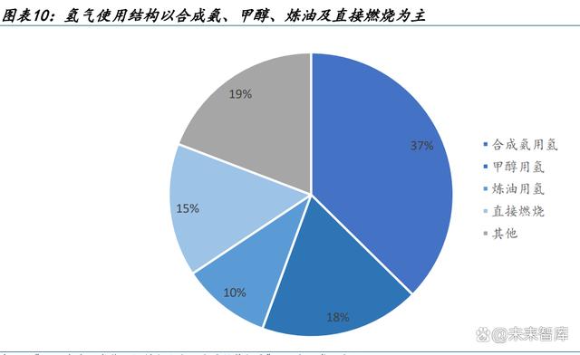 氫氣使用結構以合成氨、甲醇、煉油及直接燃燒為主。從氫氣的用途來看,最大應用領 域是作為生產合成氨中間原料,氫氣產能占比約為 30%;第二是生產甲醇,包括煤經甲 醇制烯烴的中間原料,氫氣產能占比約為 28%;第三是焦炭和蘭炭副產氫的綜合利用, 占比約為 15%(已扣除制氨醇,避免重復計算);第四是煉廠用氫,占比約為 12%;第五是 現代煤化工范疇內的煤間接液化、煤直接液化、煤制天然氣、煤制乙二醇的中間原料氫 氣,占比約為 10%;其他方式氫氣利用占比約為 5%。
