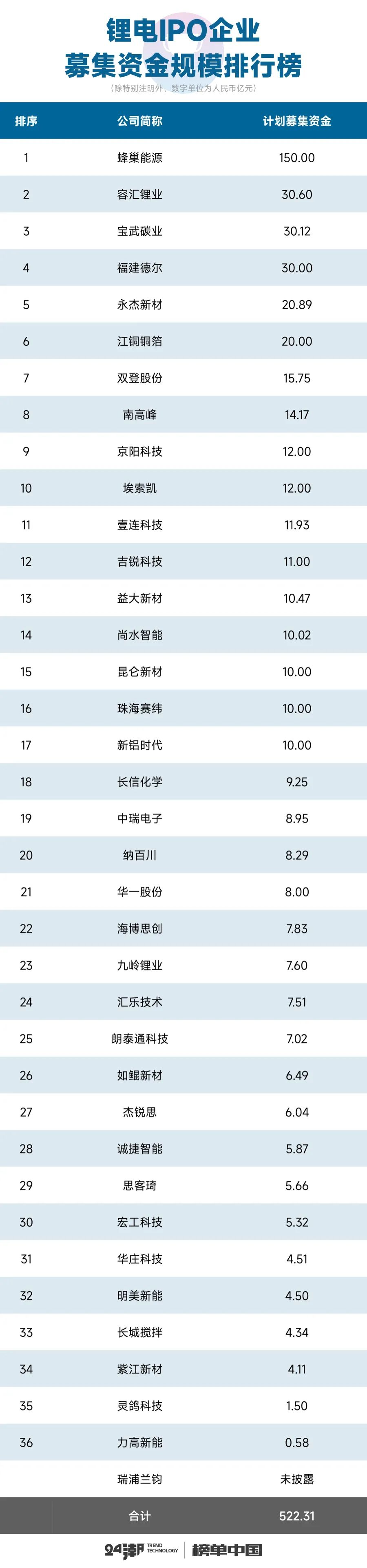 此外,頭部企業(yè)進(jìn)擊勢頭也更加兇猛:據(jù)24潮統(tǒng)計,37家企業(yè)計劃募集資金超500億元,募投項目總投資預(yù)算合計超900億元(不含 “補充流動資金” ),其中,蜂巢能源和瑞浦蘭鈞募投項目總投資預(yù)算均超百億元,兩者合計達(dá)536.71億元。