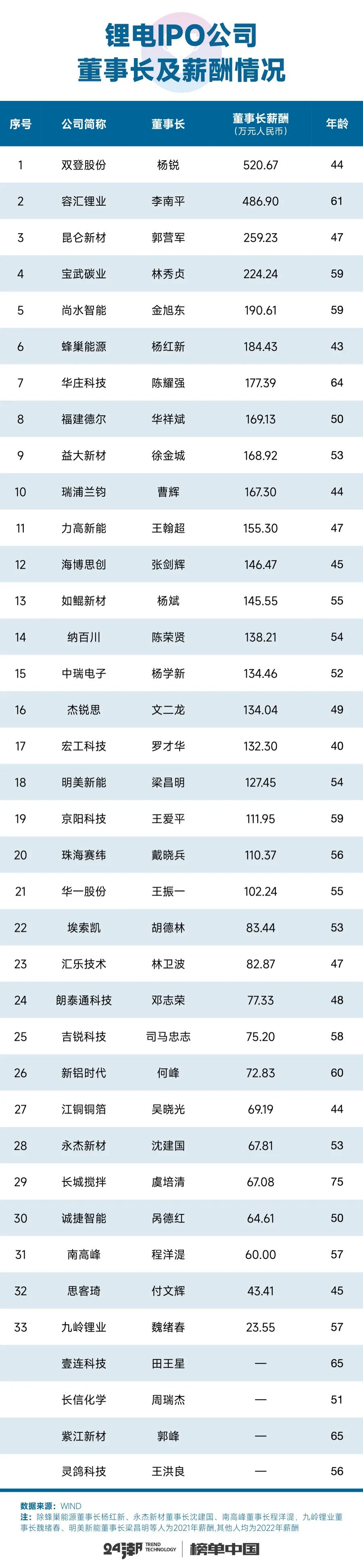 企業(yè)掌舵者的薪酬也有云壤之別,年薪酬最高的是雙登股份董事長楊銳,2022年薪酬為520.67萬元,是最后一位的22.11倍。