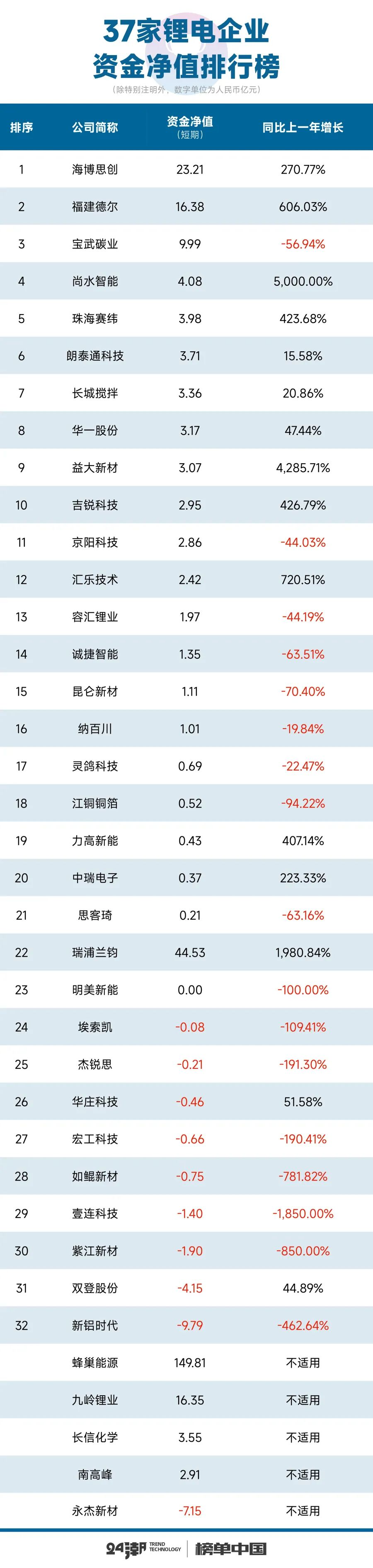 此外,多達(dá)58家鋰電企業(yè)資金凈值為負(fù),即企業(yè)擁有的資金儲備不足以覆蓋長短期有息債務(wù),其中8家企業(yè)資金缺口在100億元以上。企業(yè)間資本實力差距極為明顯。