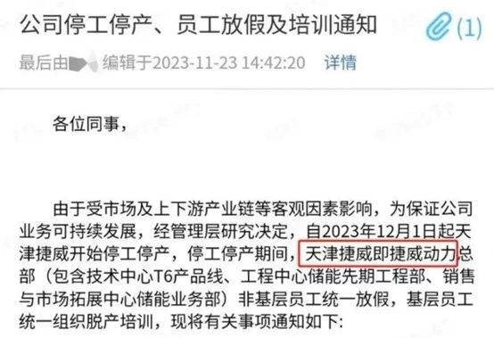 就在不久前,行業再次引發“地震”。一則天津市捷威動力工業有限公司(簡稱捷威動力)的《公司停工停產、員工放假及培訓通知》被傳開,通知顯示捷威動力計劃自12月1日起停產,復工時間將根據公司經營情況另行通知。