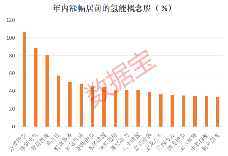 證券時報·數據寶統計,氫能概念股年內平均下跌0.6個百分點,在上漲的個股中,方盛股份、偉創電氣、致遠新能今年以來累計漲幅超過80%。蜀道裝備、東華能源、金龍汽車、云內動力等15股今年以來累計漲幅超過30%。